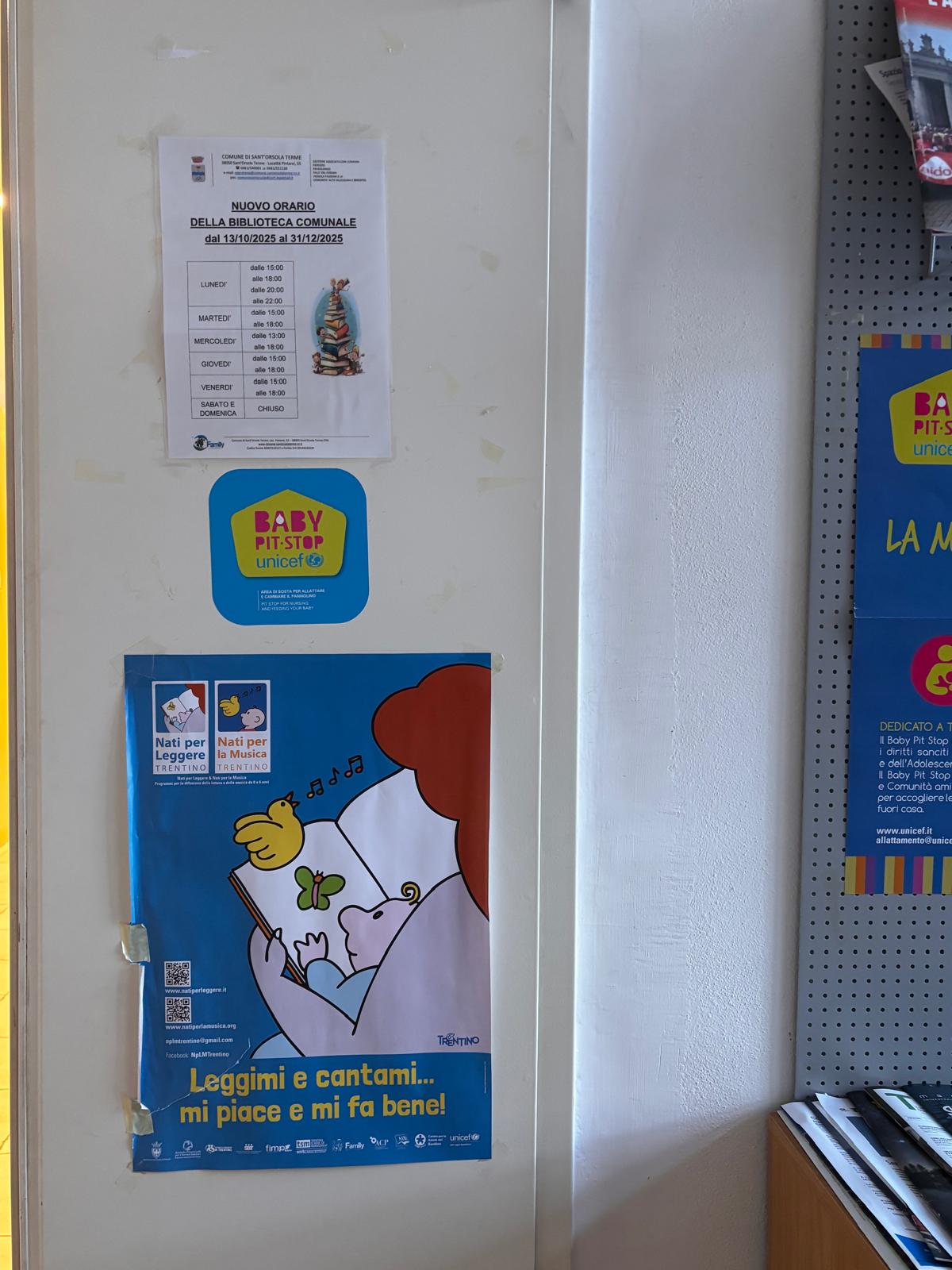 Nell'atrio del bagno della biblioteca, a piano terra, è presente un fasciatoio con il materiale necessario per il cambio del bambino.