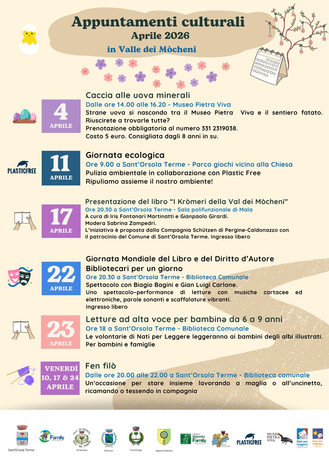 Si condivide la locandina con il calendario degli appuntamenti in Valle dei Mòcheni, in programma dal 4 al 24 aprile 2026.